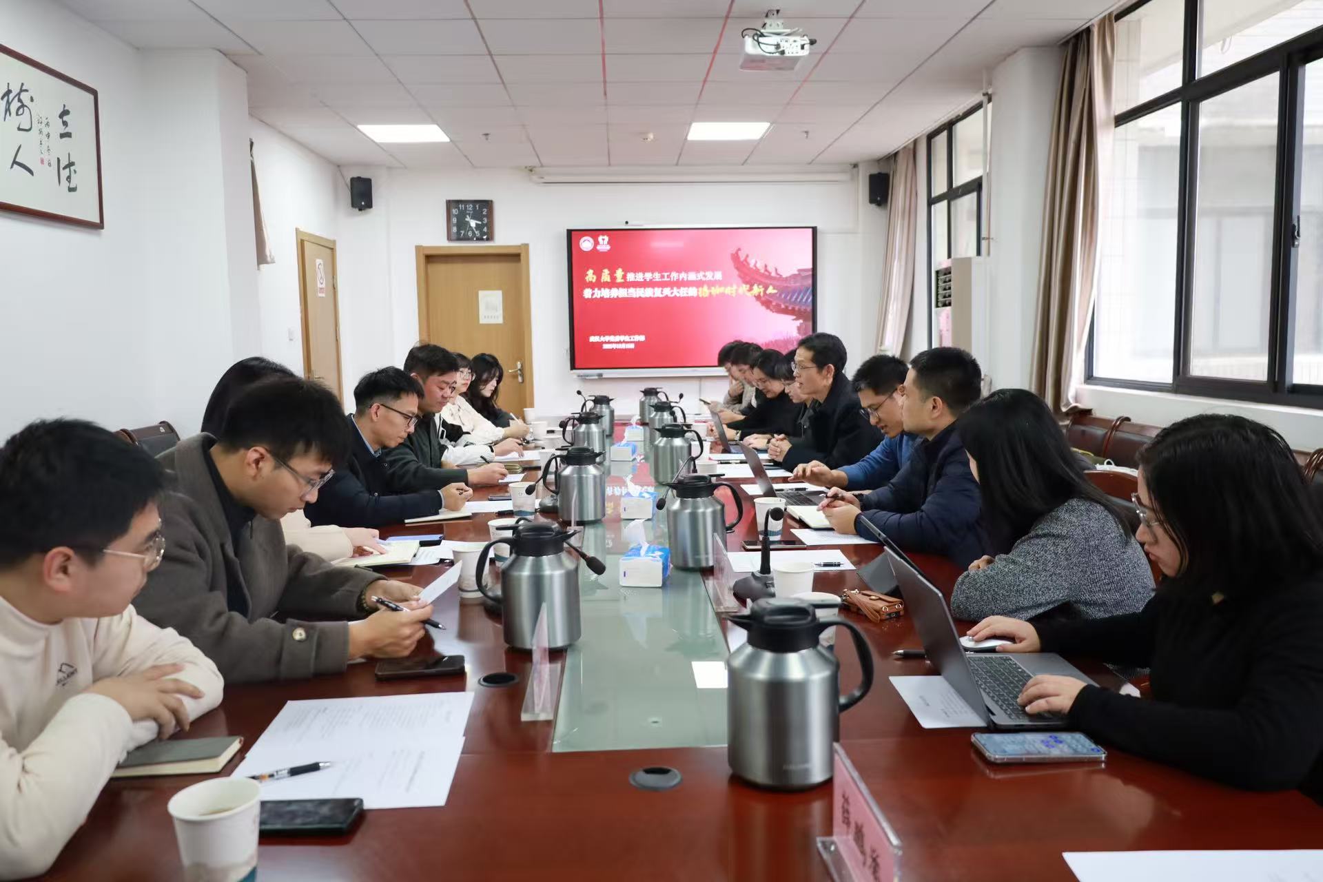 12月15日下午,调研团队一行来到武汉大学。首先参观了武汉大学校史馆,感受武大百年厚重历史底蕴与珞珈精神。随后,在本科生院412会议室与武汉大学学生工作同仁展开座谈。会议由武汉大学党委学生工作部副部长徐国章主持,徐国章副部长首先介绍了武汉大学学生工作的整体情况、发展理念与实践成效。随后,双方围绕教育部高校思想政治工作队伍研修中心建设、辅导员队伍培养、思政引领力提升及“一站式”学生社区建设等关键议题进行深入交流。武汉大学党委学生工作部副部长陈菊平、学生事务管理办公室主任苏鹏宇、教育部高校思想政治工作队伍培训研修中心(武汉大学)办公室副主任韩炜等,结合工作实际分享了如何高质量推进学生工作内涵式发展、如何打造“一站式”学生社区育人矩阵、思政育人体系构建与品牌打造等诸多创新性做法与宝贵经验。我校调研团队成员结合自身工作困惑与发展需求,就具体工作中的重点难点问题与对方展开互动探讨,现场交流氛围热烈融洽。